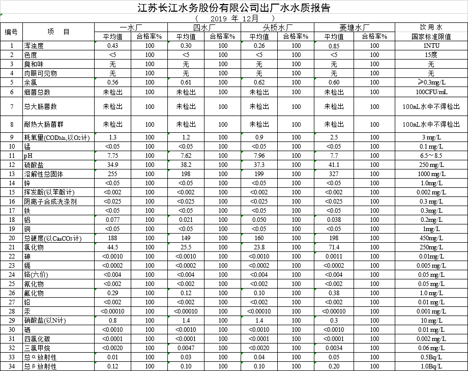 自來(lái)水水質(zhì)報(bào)告(2019年12月份)